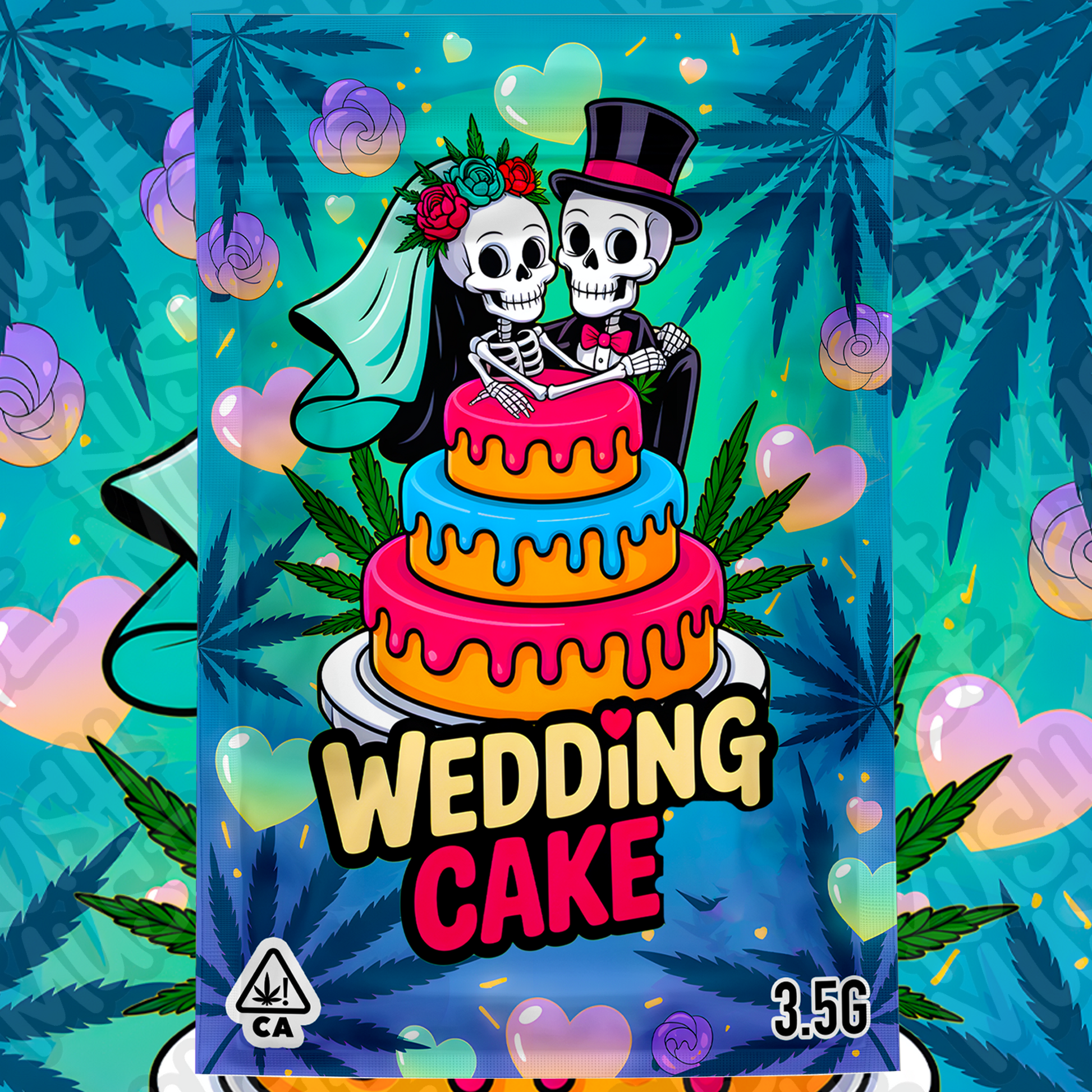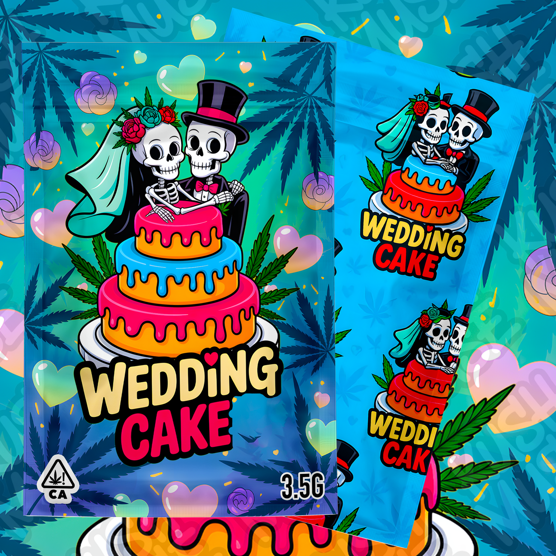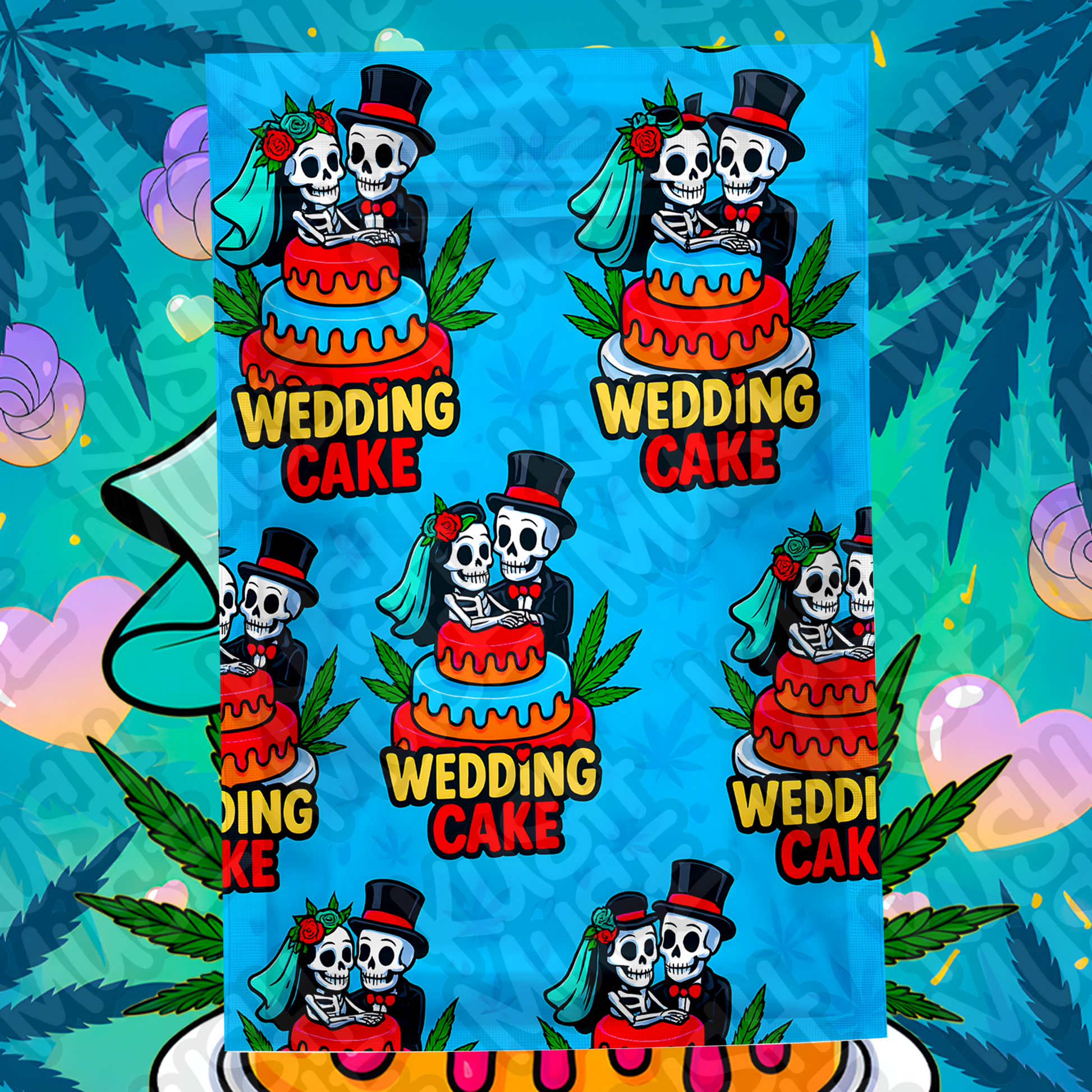 Add a bold and romantic twist to your cannabis packaging with this Wedding Cake 3.5g Mylar Bag Design. Featuring a colorful cartoon-style skeleton bride and groom on a melting wedding cake, this vibrant front-and-back design is perfect for weed brands that want to stand out.